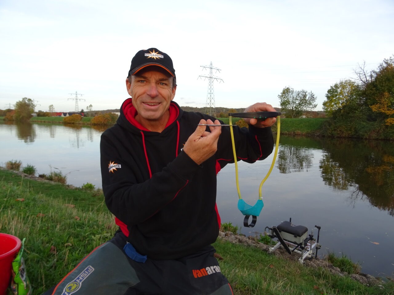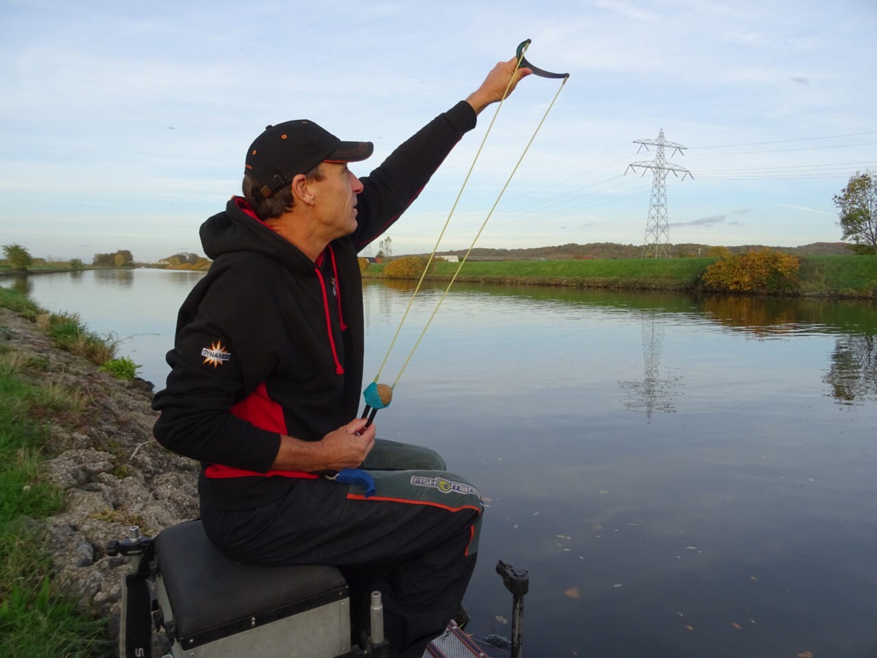 I shoot a ball of groundbait at a measured distance with the full stretch of the elastic.